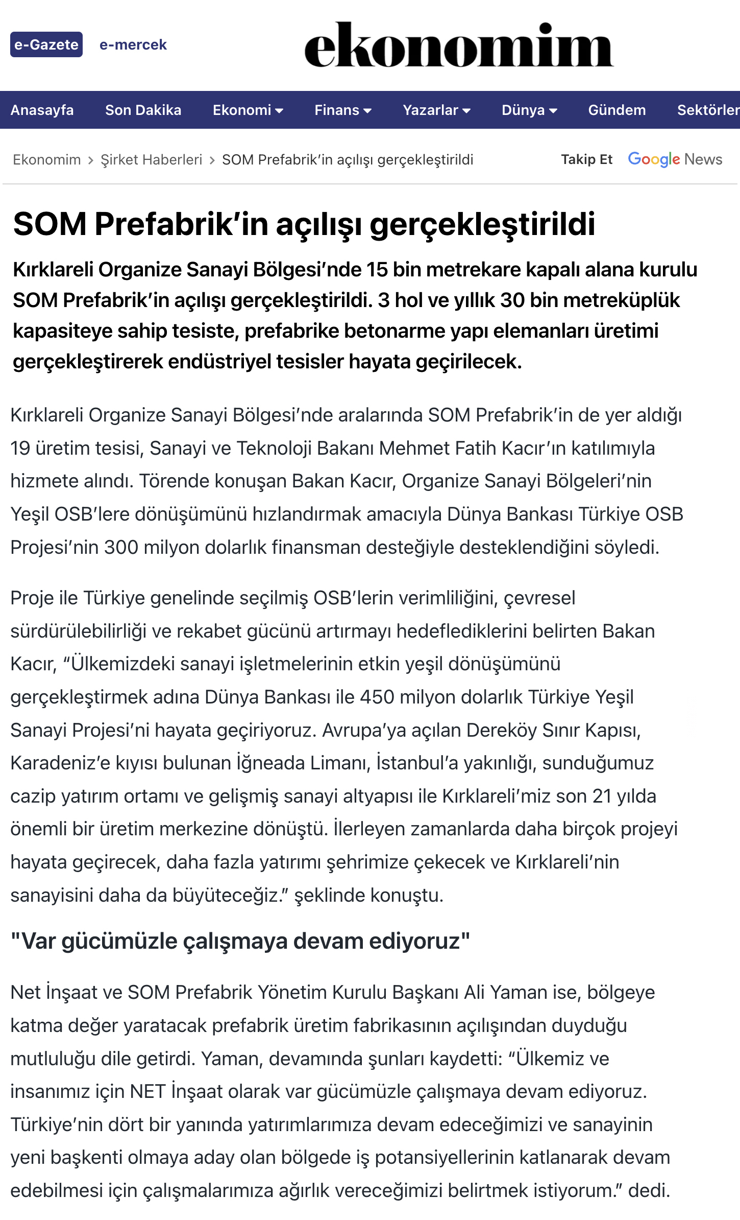 Net İnşaat ve SOM Prefabrik Yönetim Kurulu Başkanı Ali Yaman ise, bölgeye katma değer yaratacak prefabrik üretim fabrikasının açılışından duyduğu mutluluğu dile getirdi. Yaman, devamında şunları kaydetti: “Ülkemiz ve insanımız için NET İnşaat olarak var gücümüzle çalışmaya devam ediyoruz. Türkiye’nin dört bir yanında yatırımlarımıza devam edeceğimizi ve sanayinin yeni başkenti olmaya aday olan bölgede iş potansiyellerinin katlanarak devam edebilmesi için çalışmalarımıza ağırlık vereceğimizi belirtmek istiyorum.” dedi.