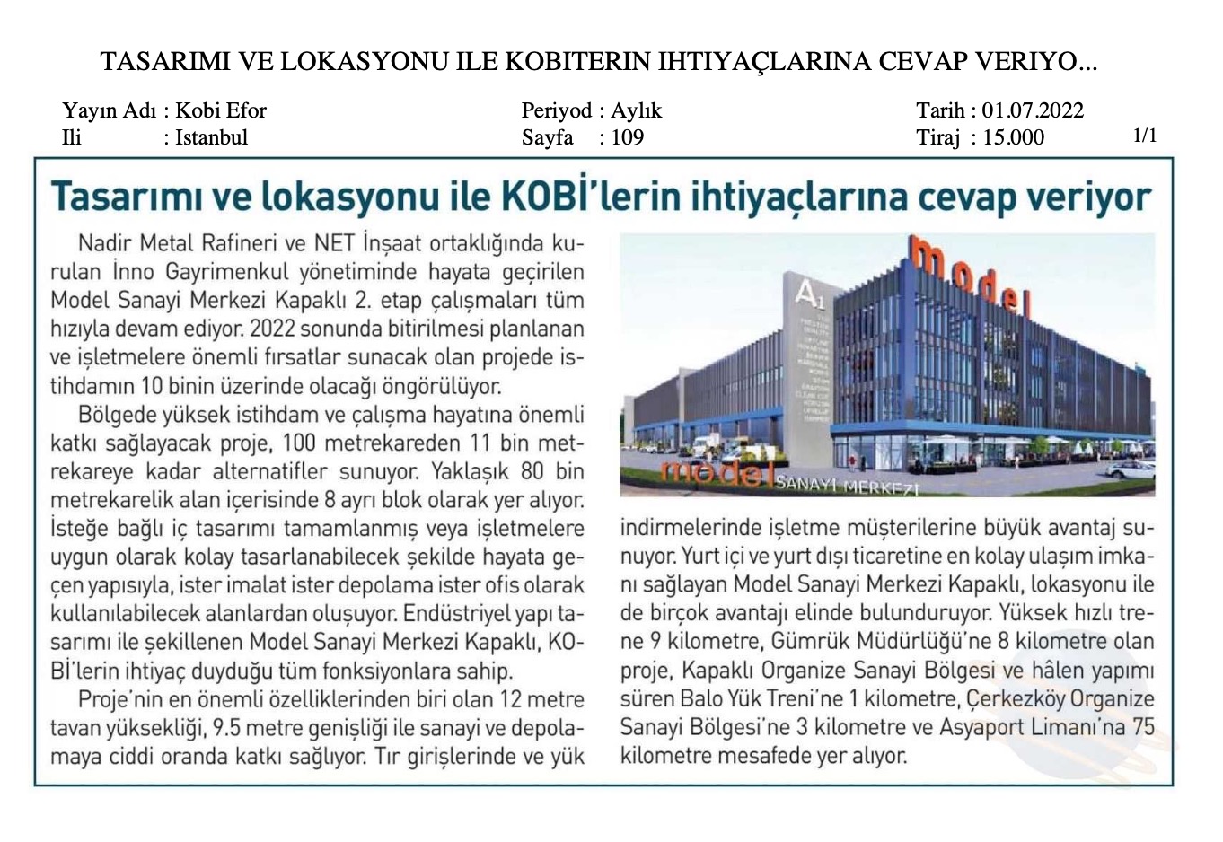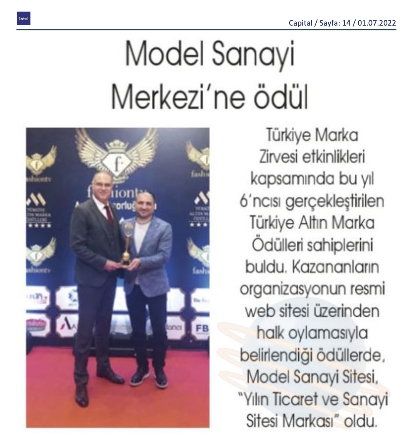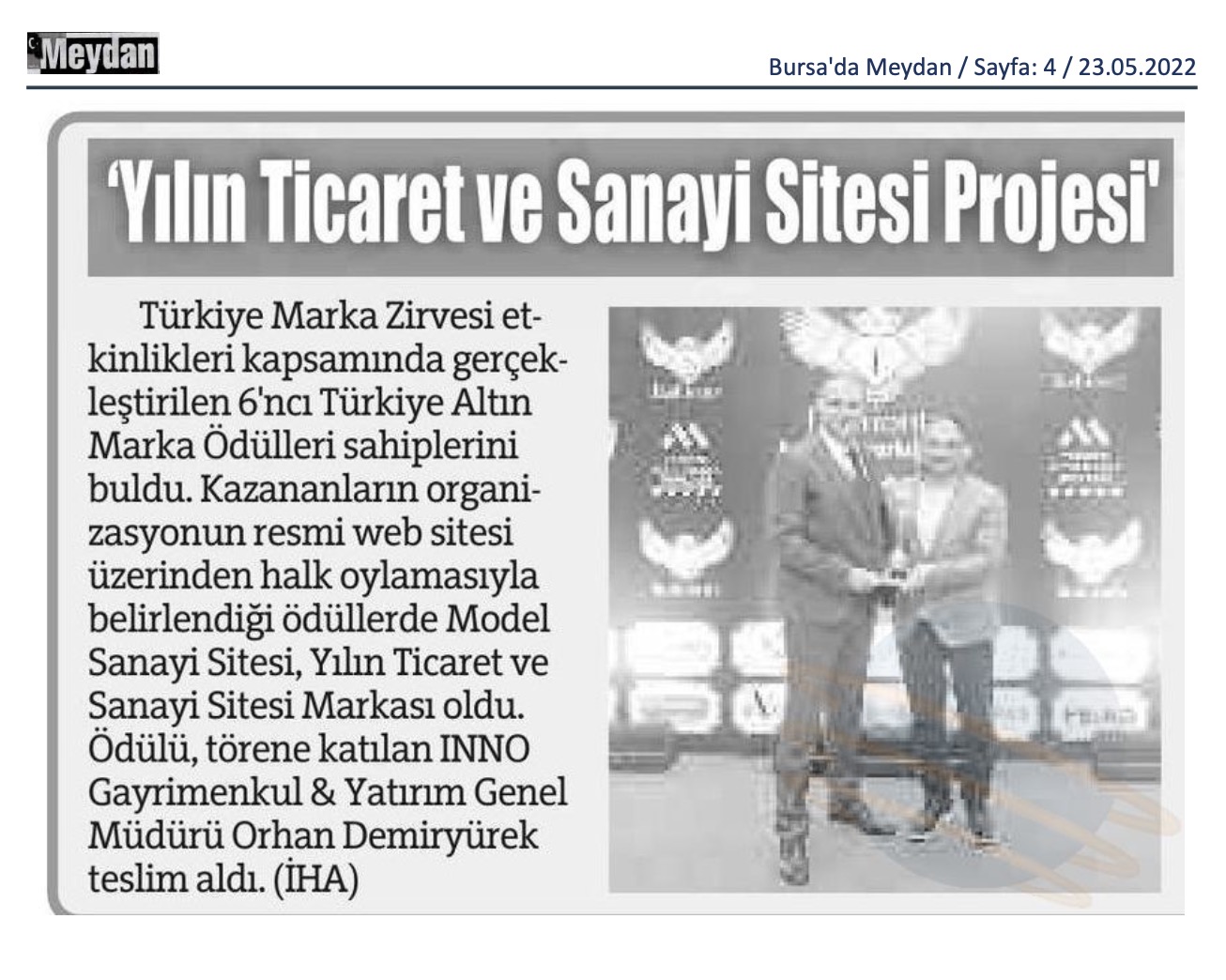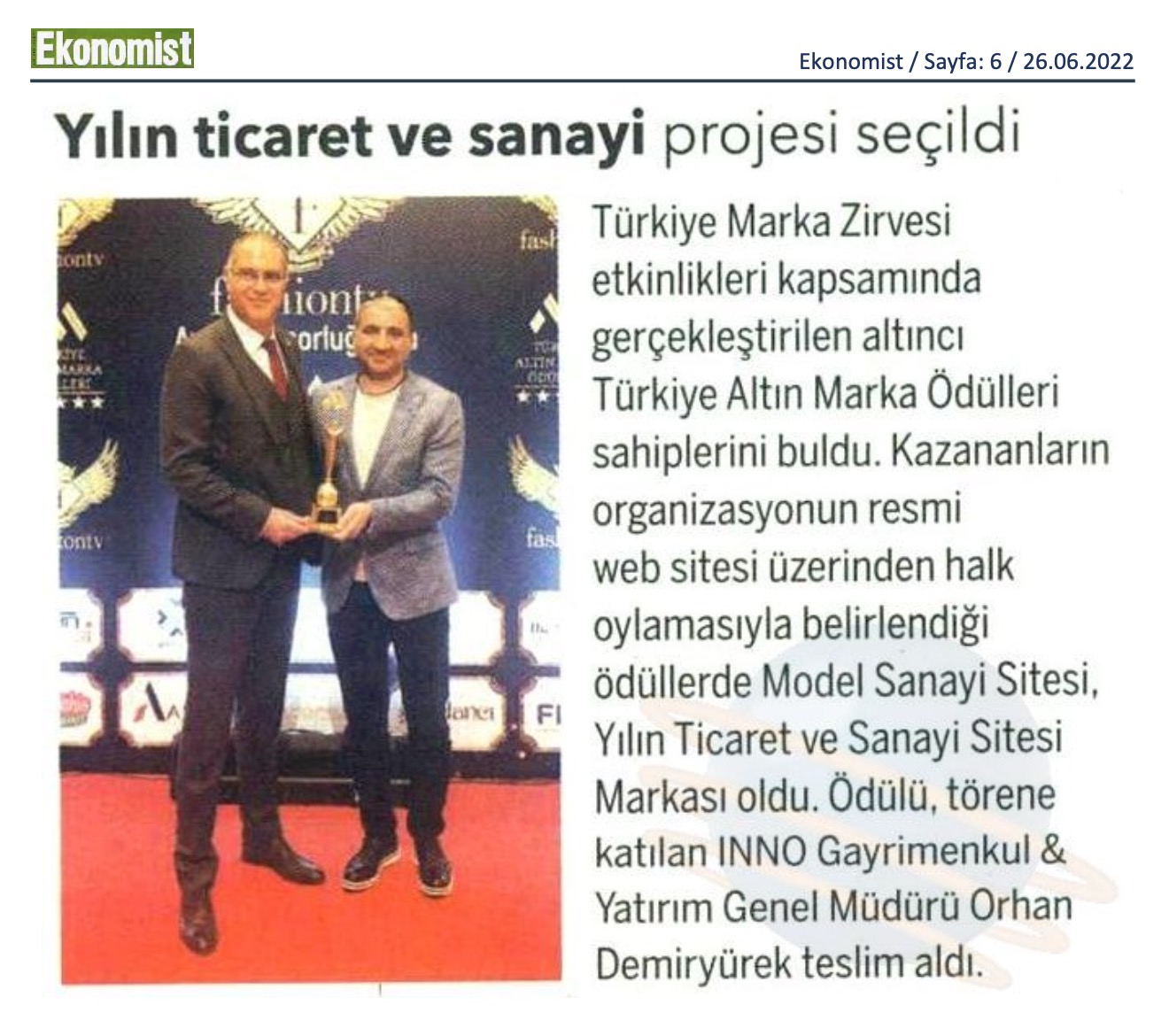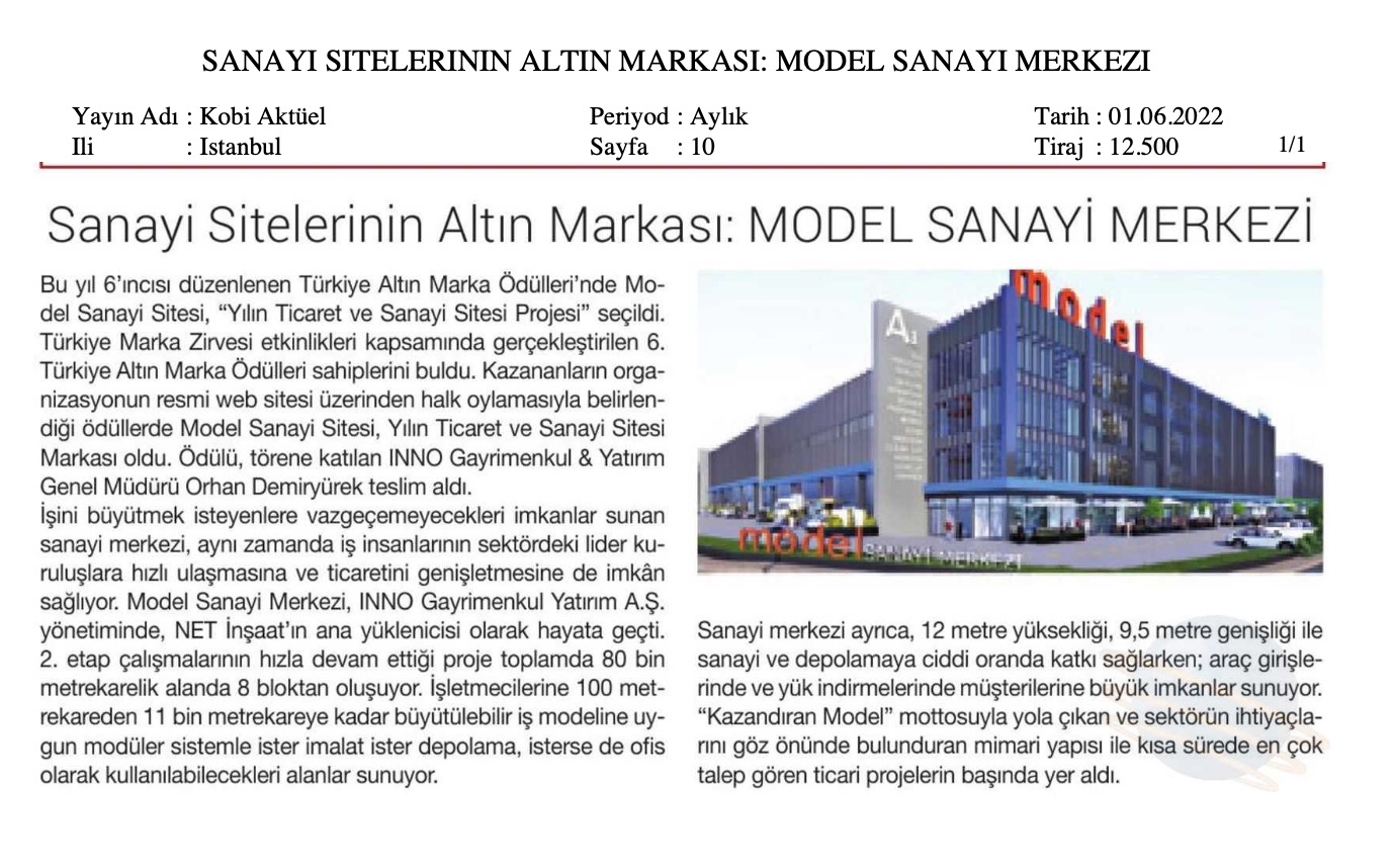 Türkiye Marka Zirvesi etkinlikleri kapsamında gerçekleştirilen altıncı Türkiye Altın Marka Ödülleri sahiplerini buldu. Kazananların organizasyonun resmi web sitesi üzerinden halk oylamasıyla belirlendiği ödüllerde Model Sanayi Sitesi, Yılın Ticaret ve Sanayi Sitesi Markası oldu. Ödülü, törene katılan INNO Gayrimenkul & Yatırım Genel Müdürü Orhan Demiryürek teslim aldı.